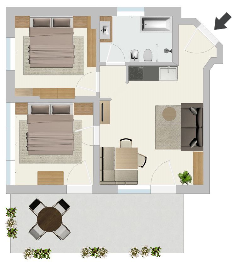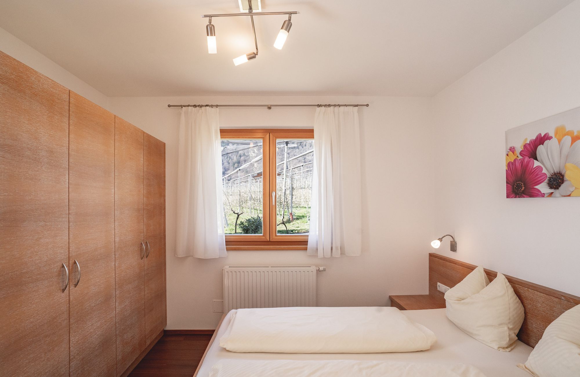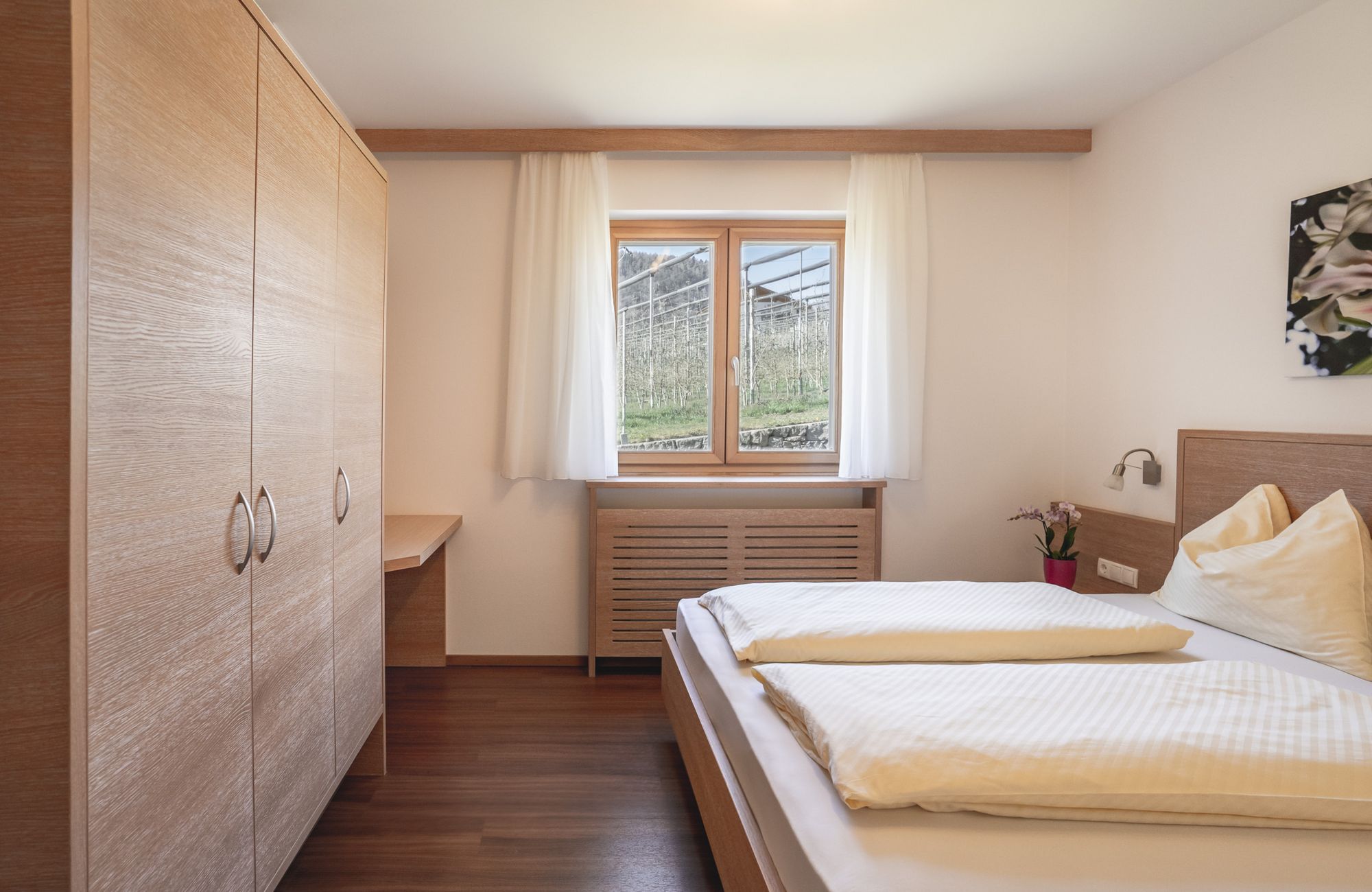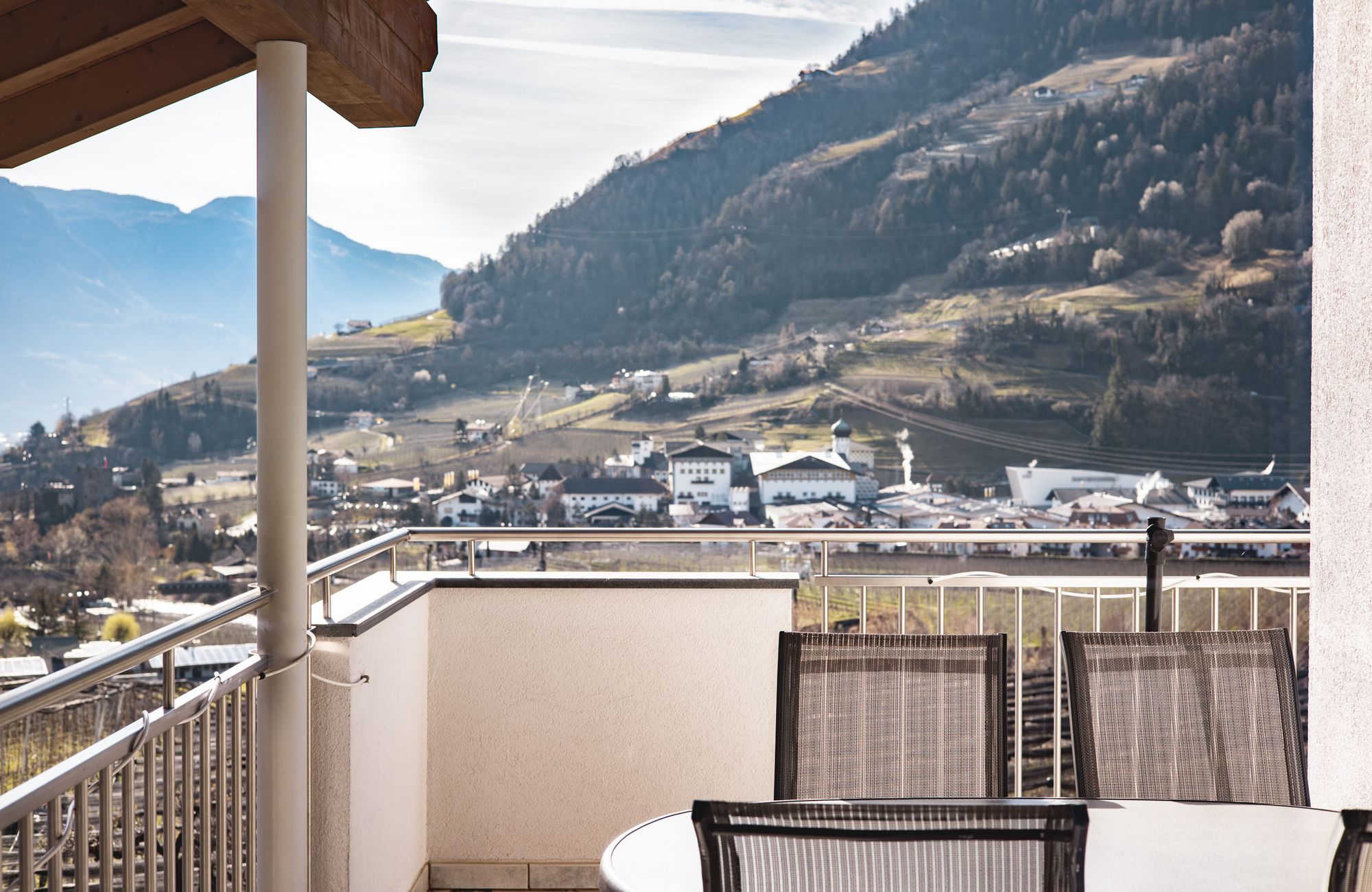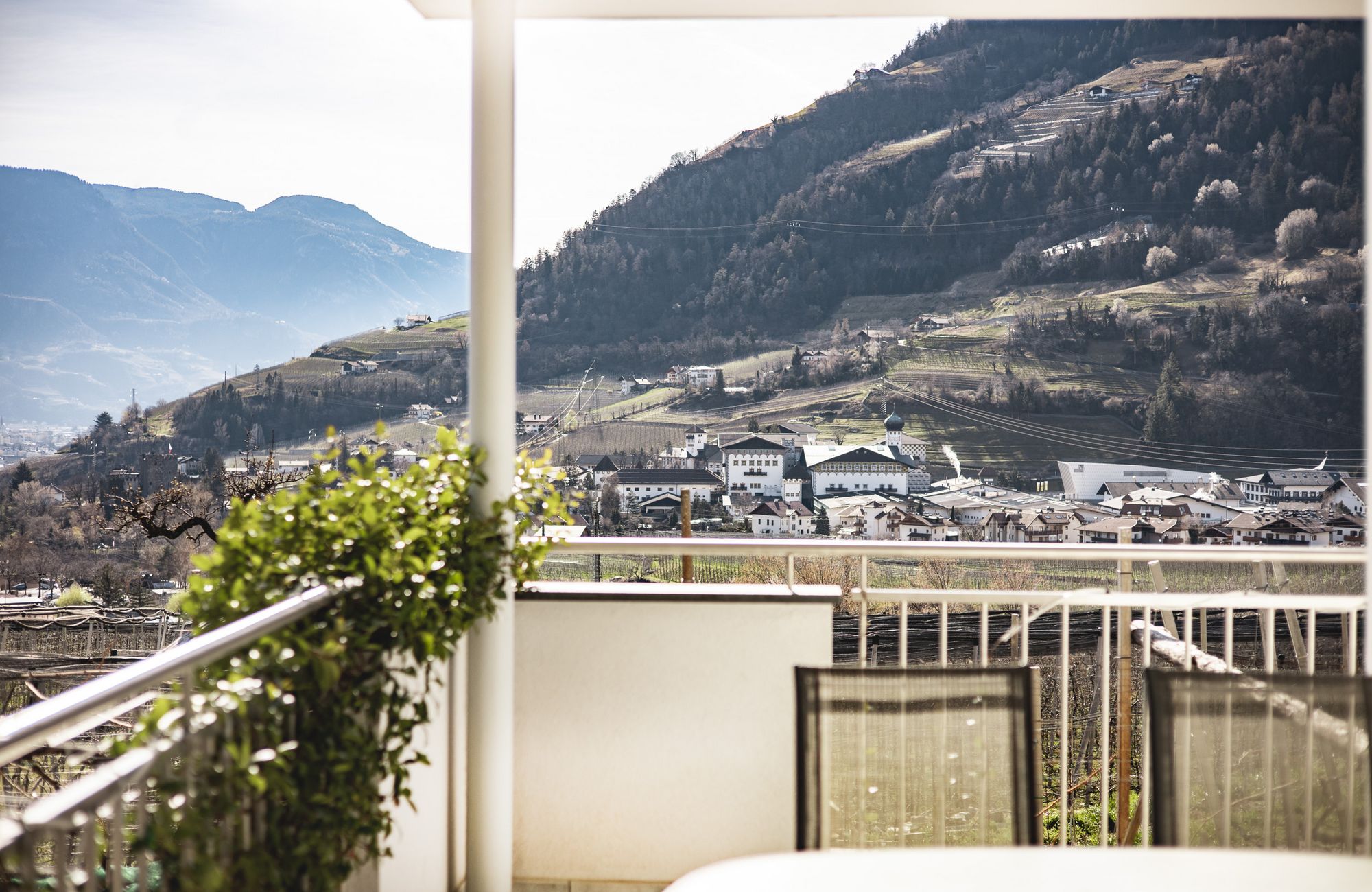 Jedes Appartement verfügt über getrennte Schlafräume, Bad mit Dusche/WC, einen hellen Wohnraum und eine große Terrasse (20 m²) mit Blick auf Meran.
