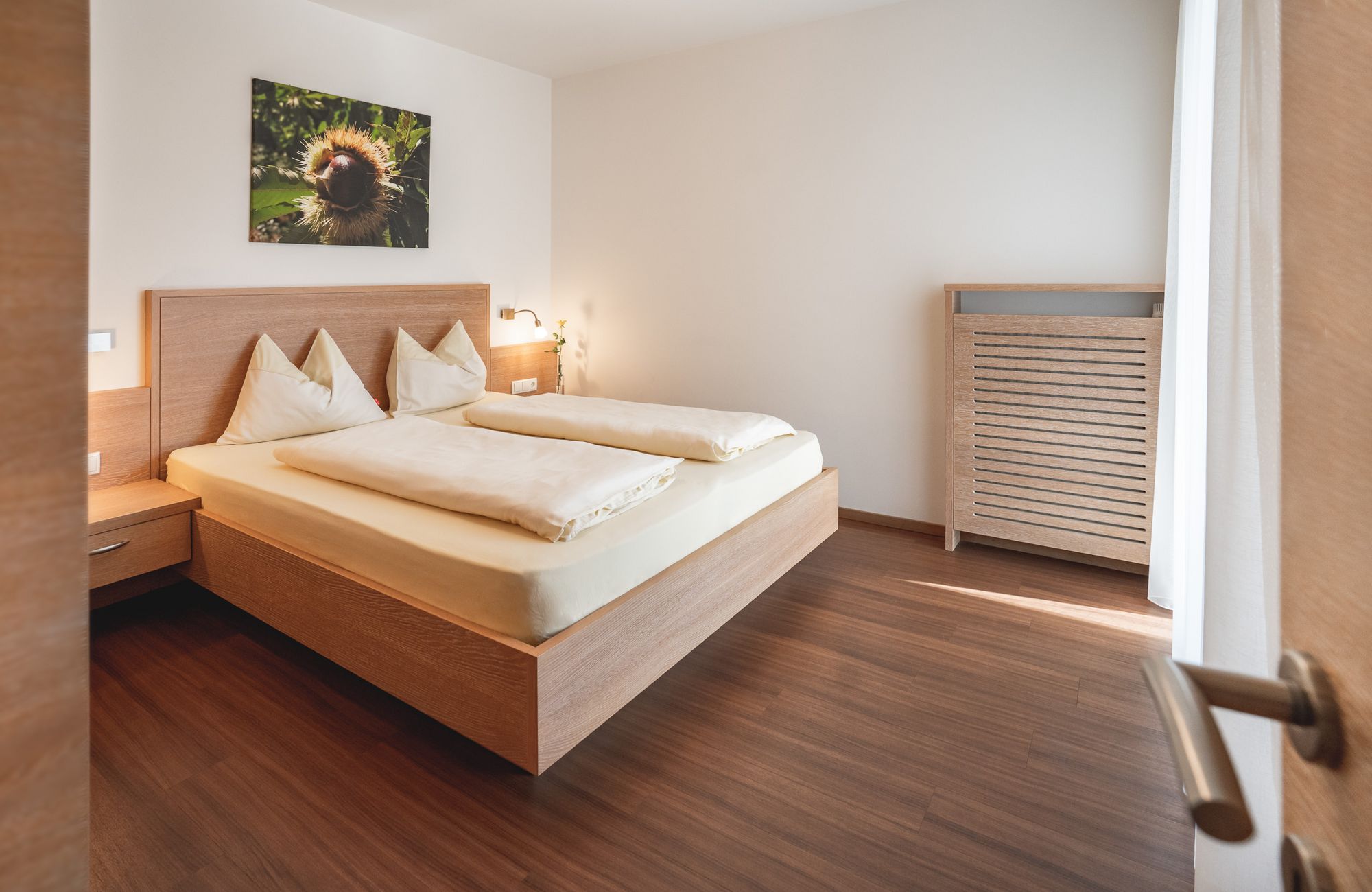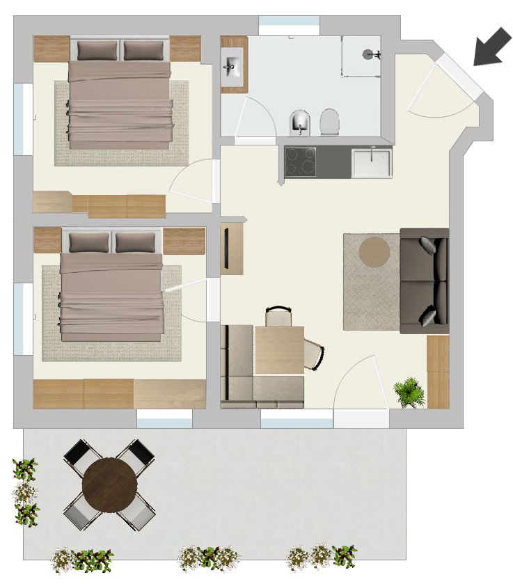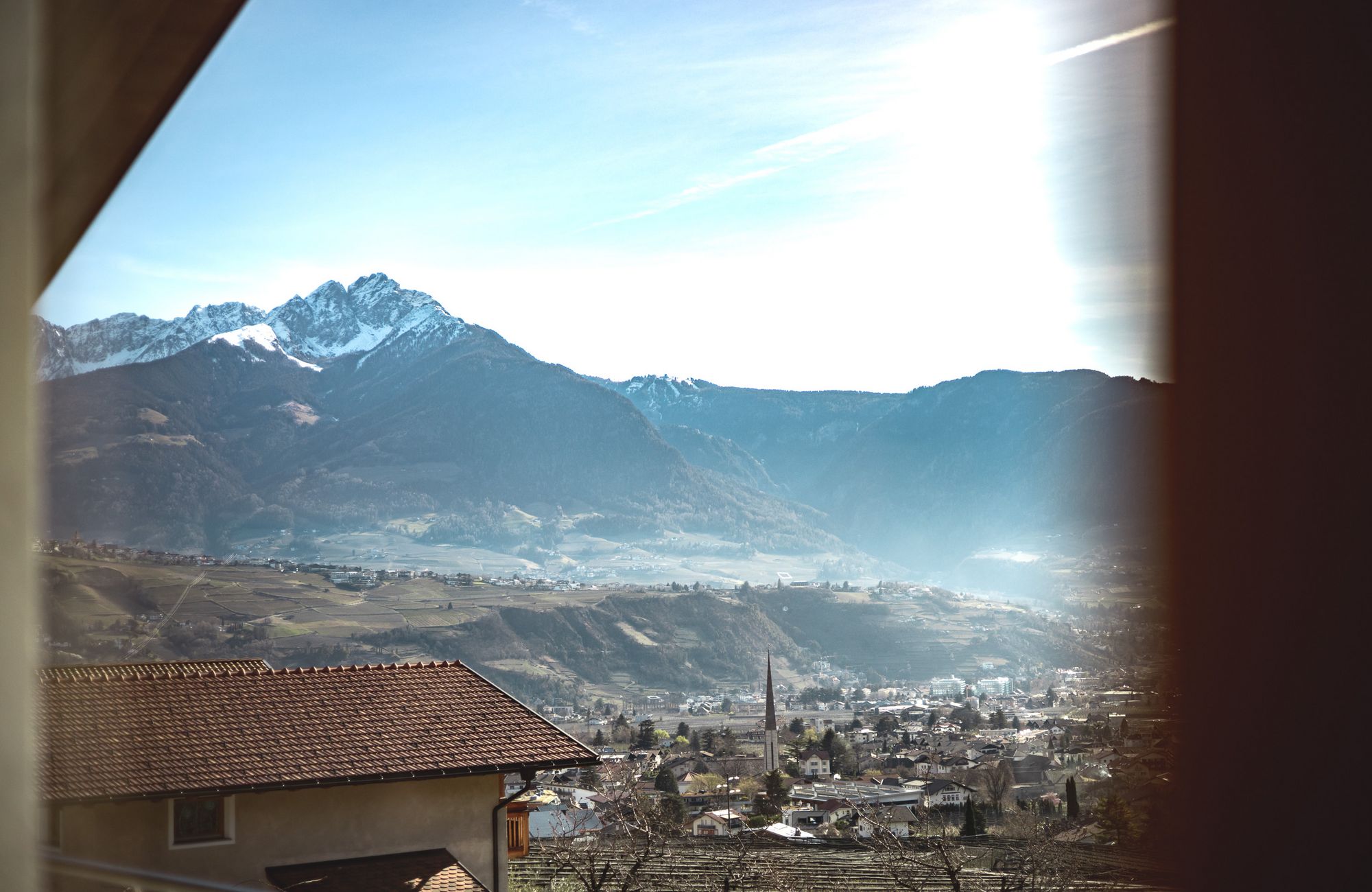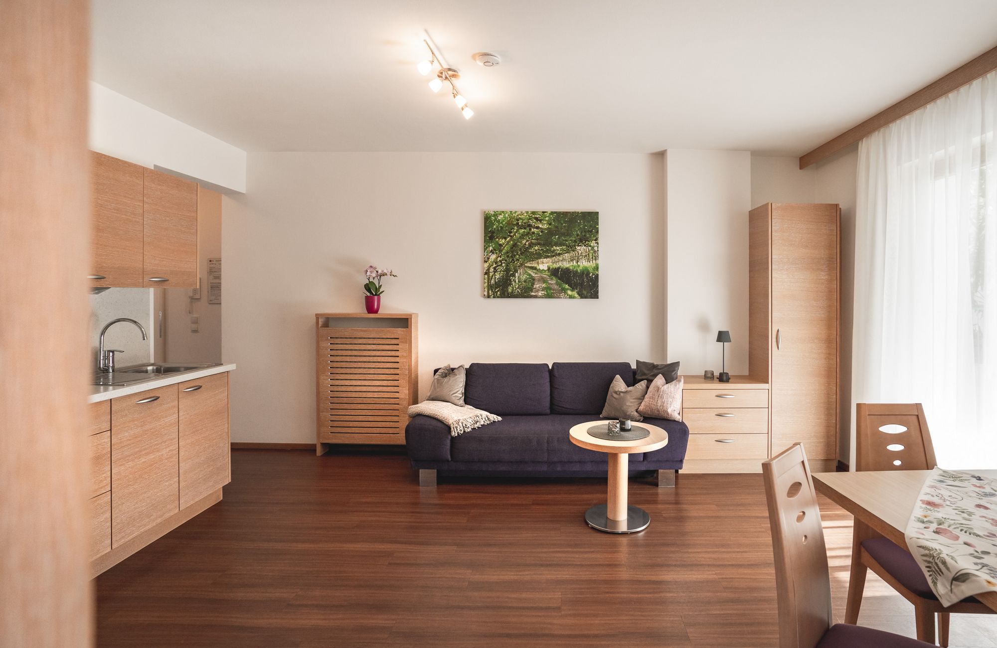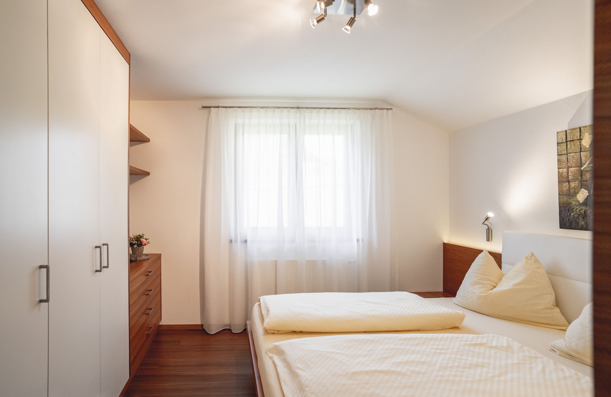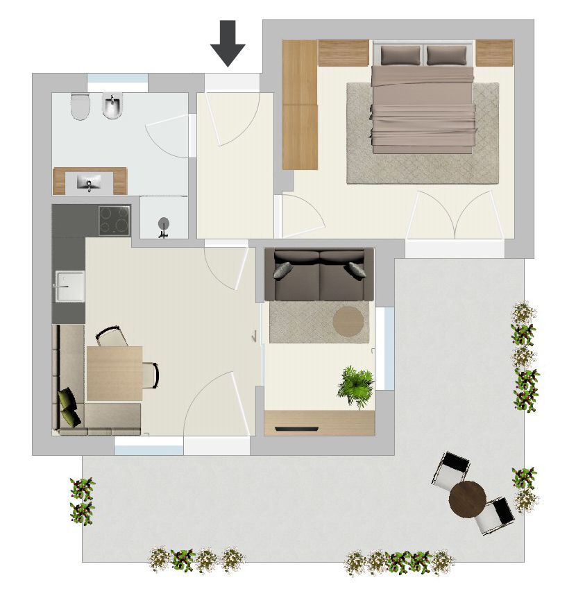 Jedes Appartement verfügt über getrennte Schlafräume, Bad mit Dusche/WC, einen hellen Wohnraum und eine große Terrasse (20 m²) mit Blick auf Meran.