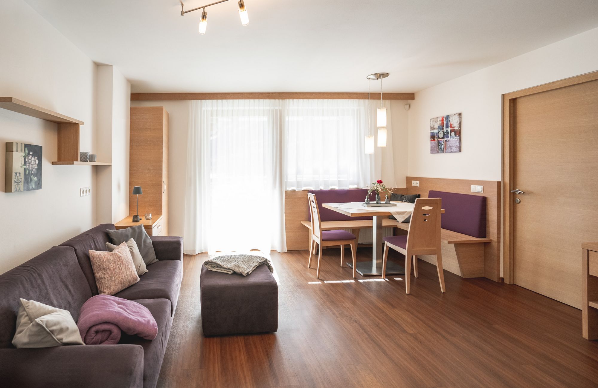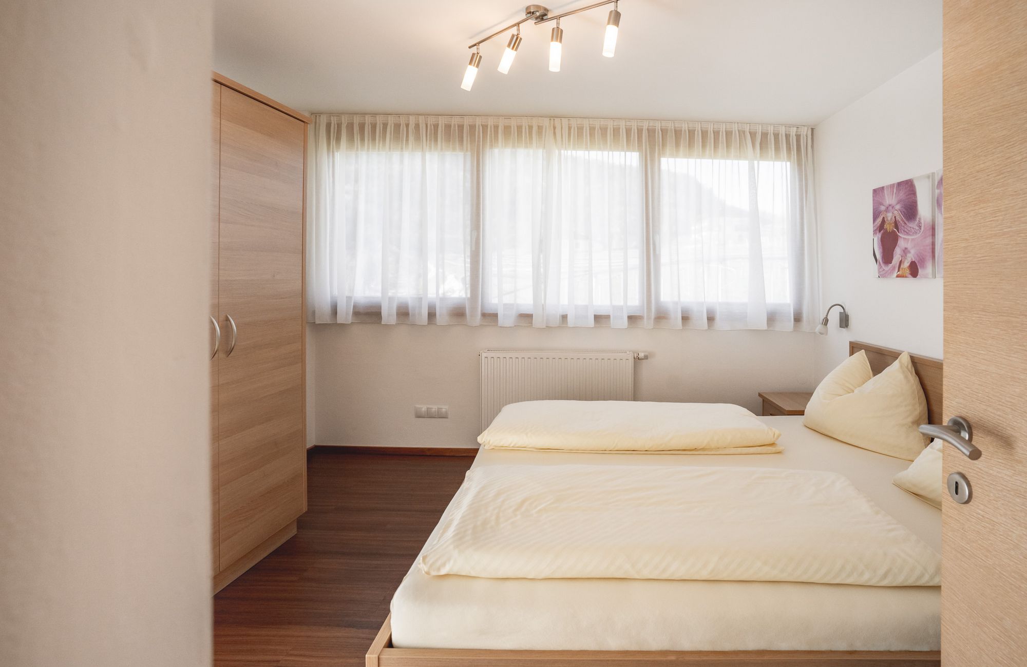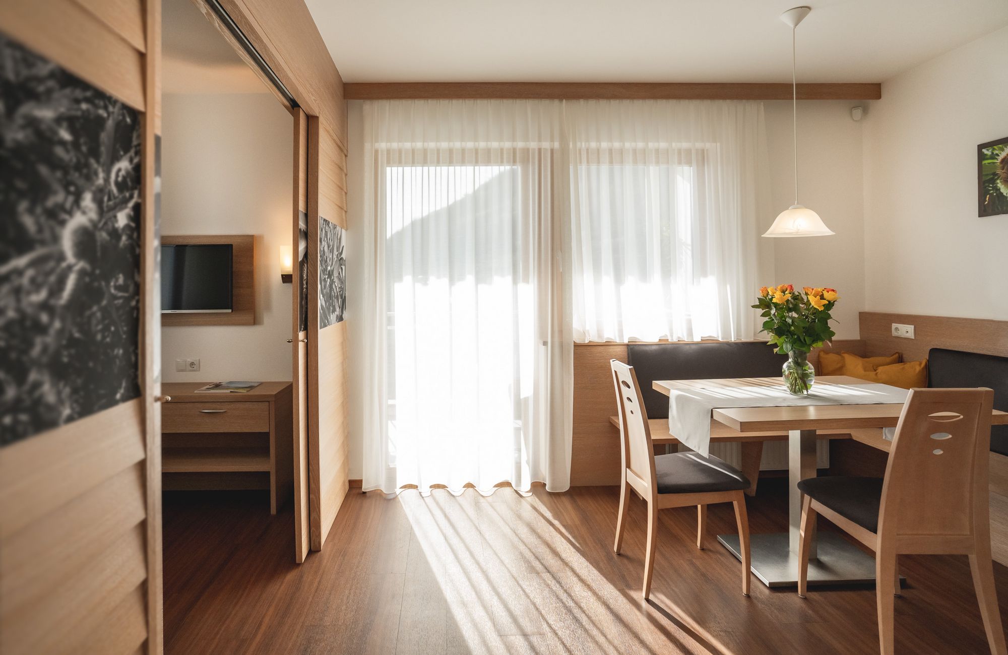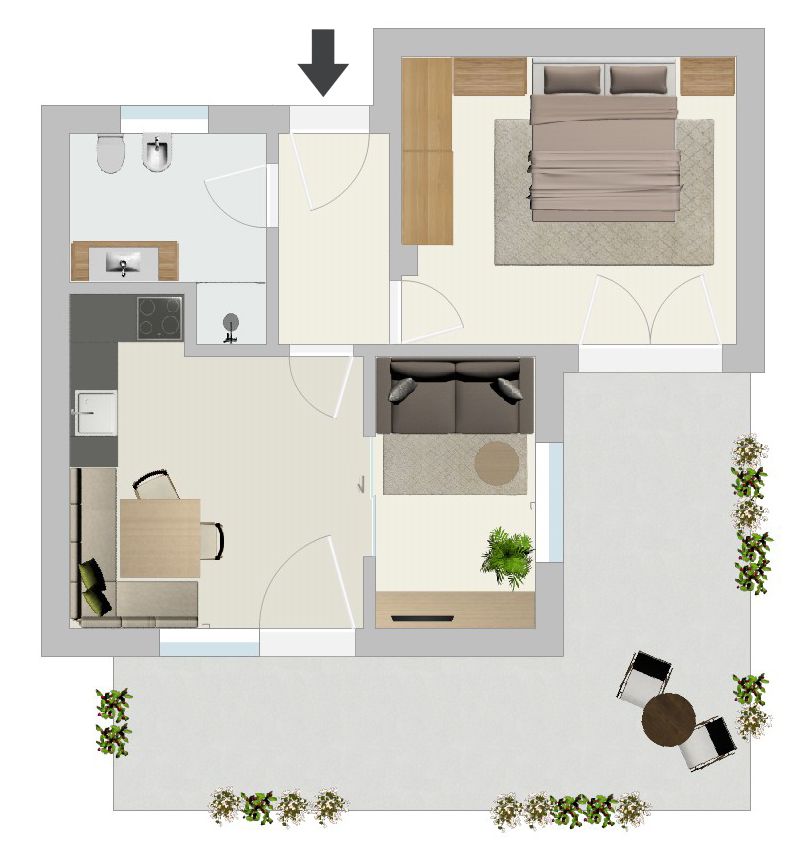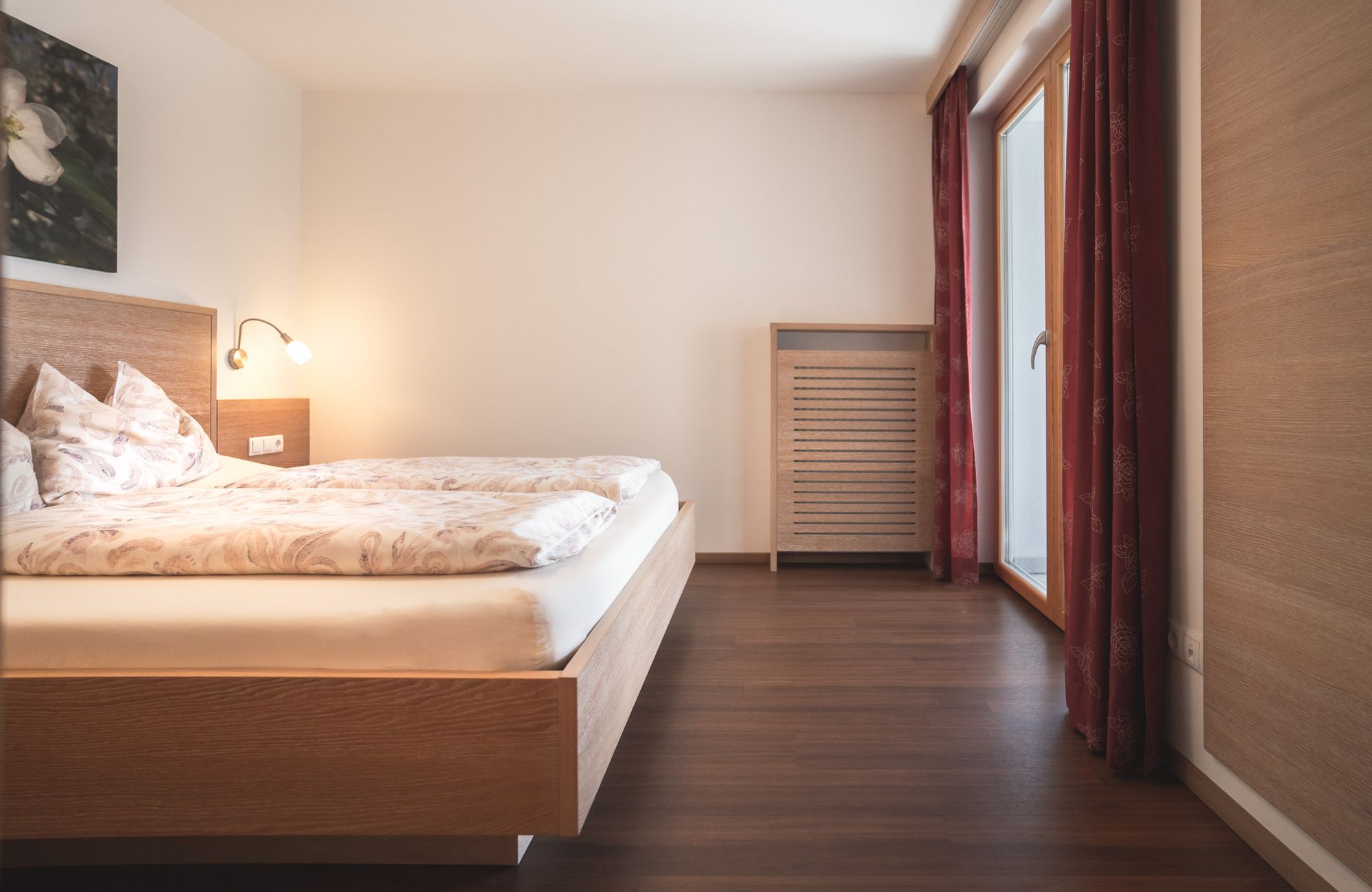 Jedes Appartement verfügt über getrennte Schlafräume, Bad mit Dusche/WC, einen hellen Wohnraum und eine große Terrasse (20 m²) mit Blick auf Meran.