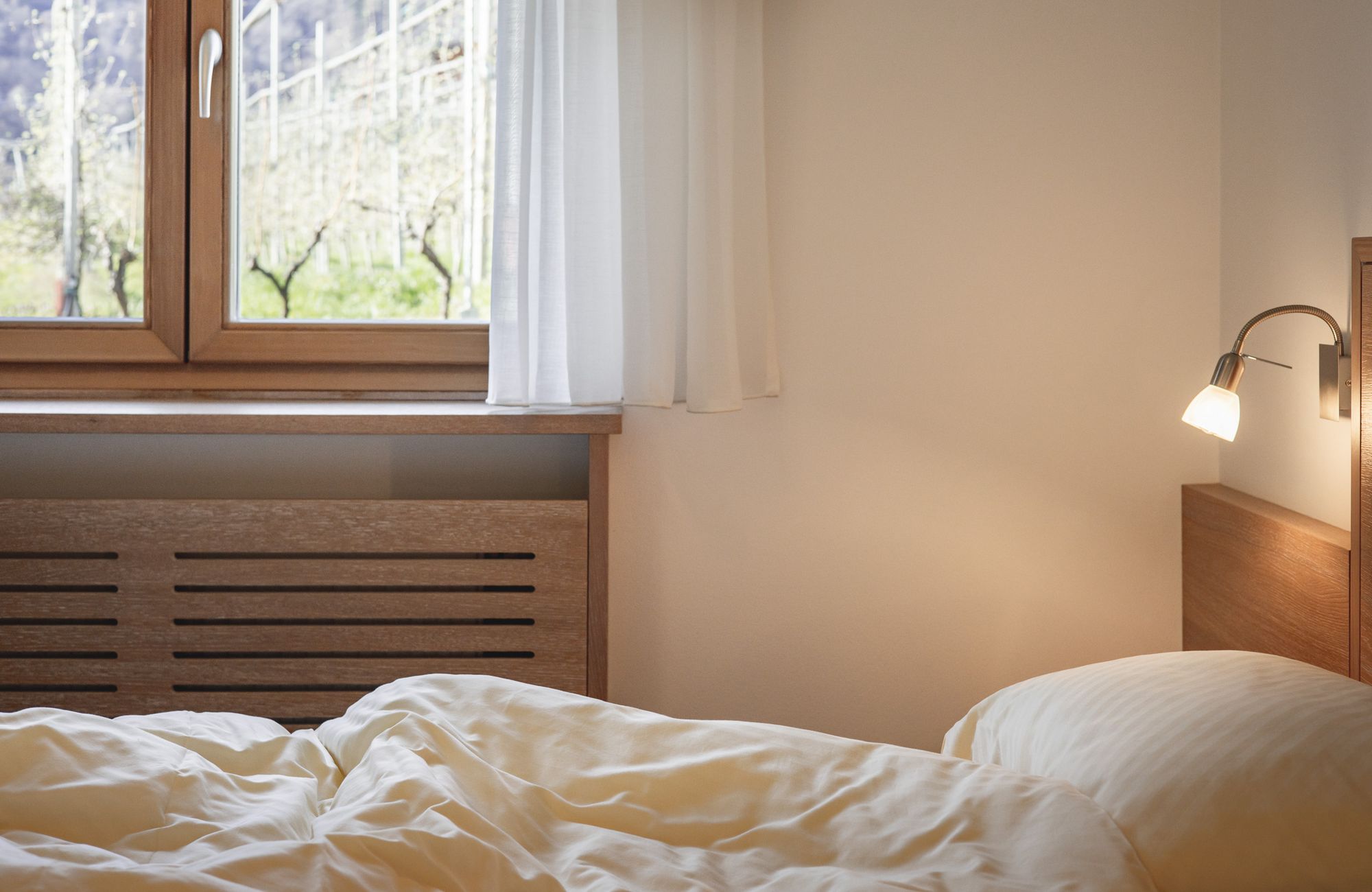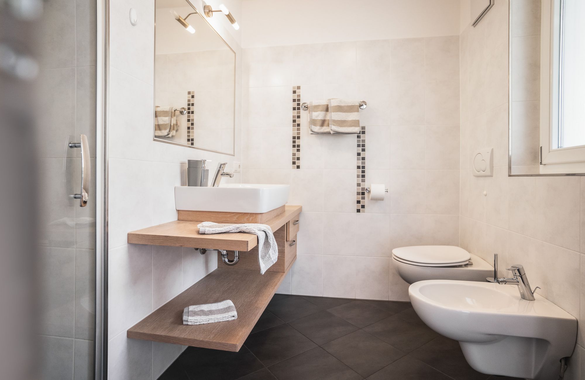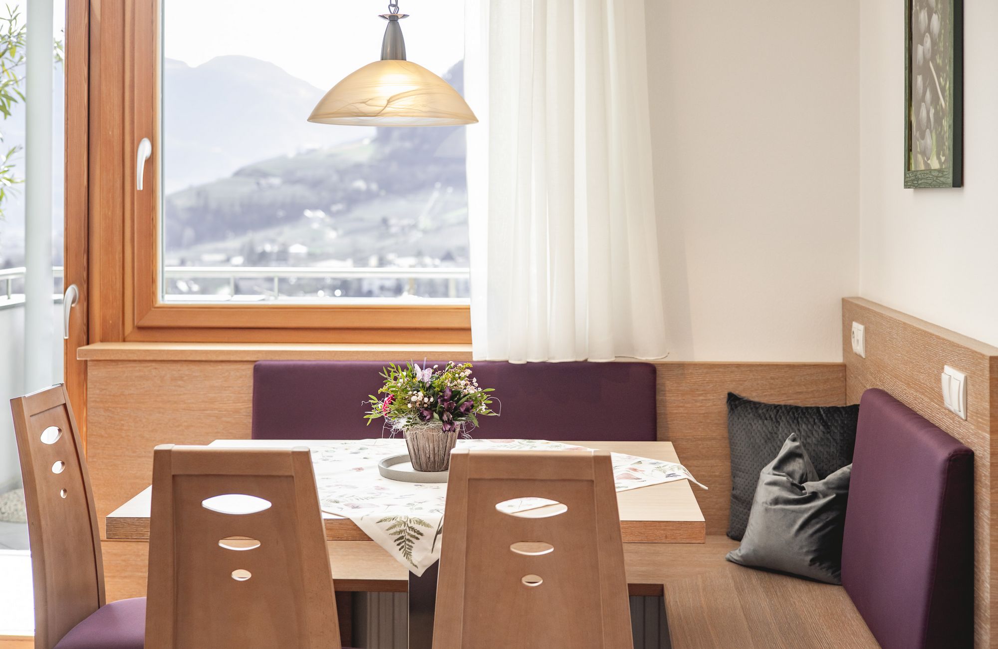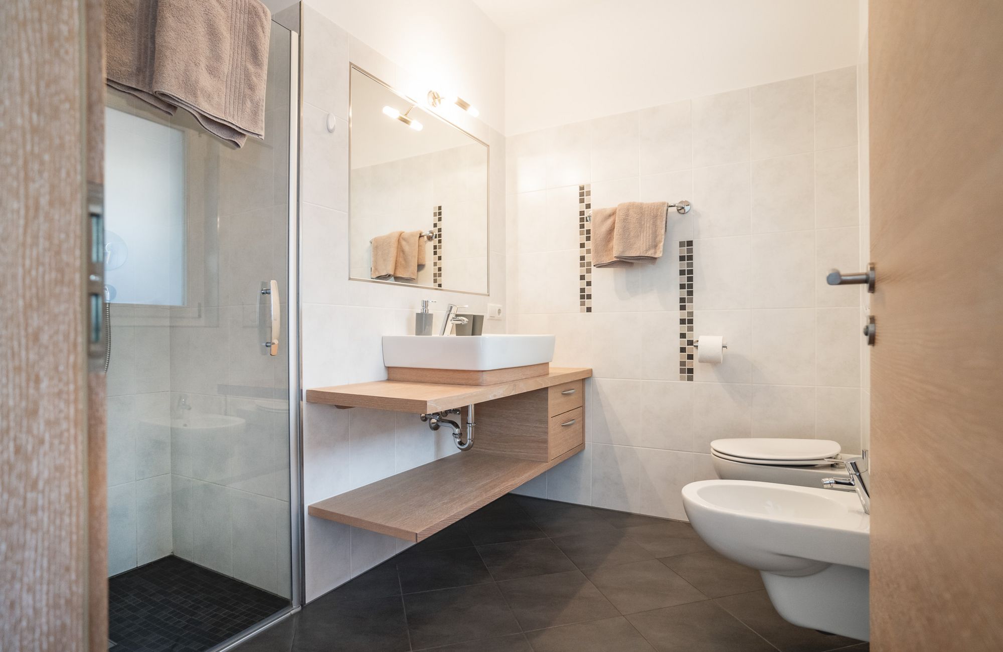 Jedes Appartement verfügt über getrennte Schlafräume, Bad mit Dusche/WC, einen hellen Wohnraum und eine große Terrasse (20 m²) mit Blick auf Meran.