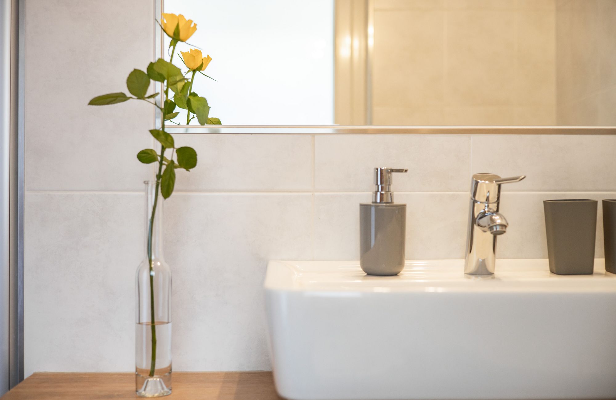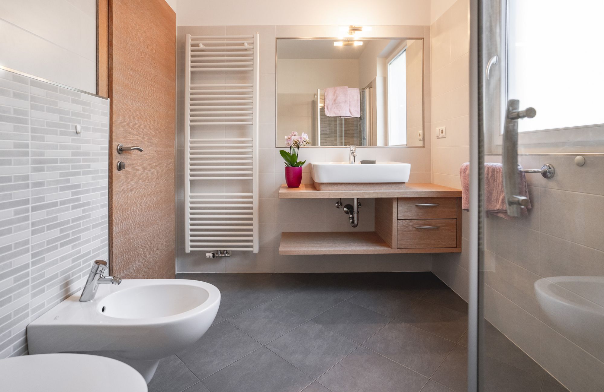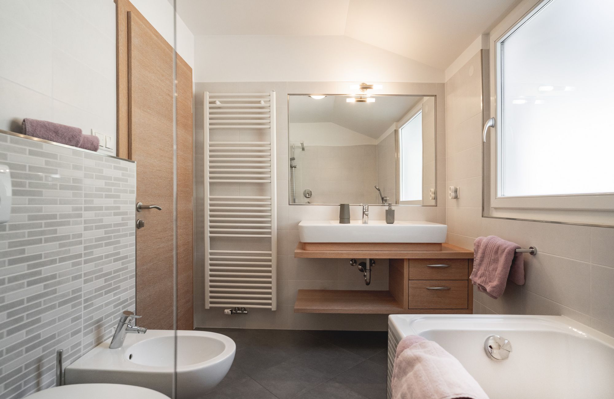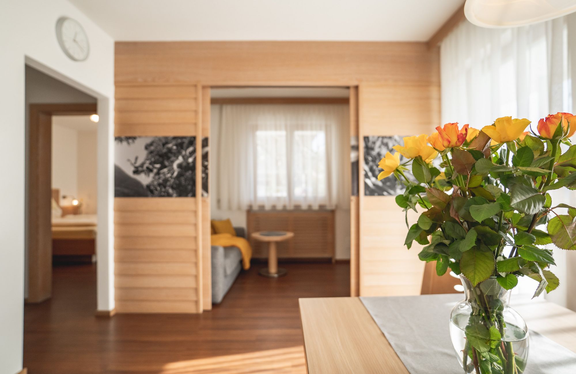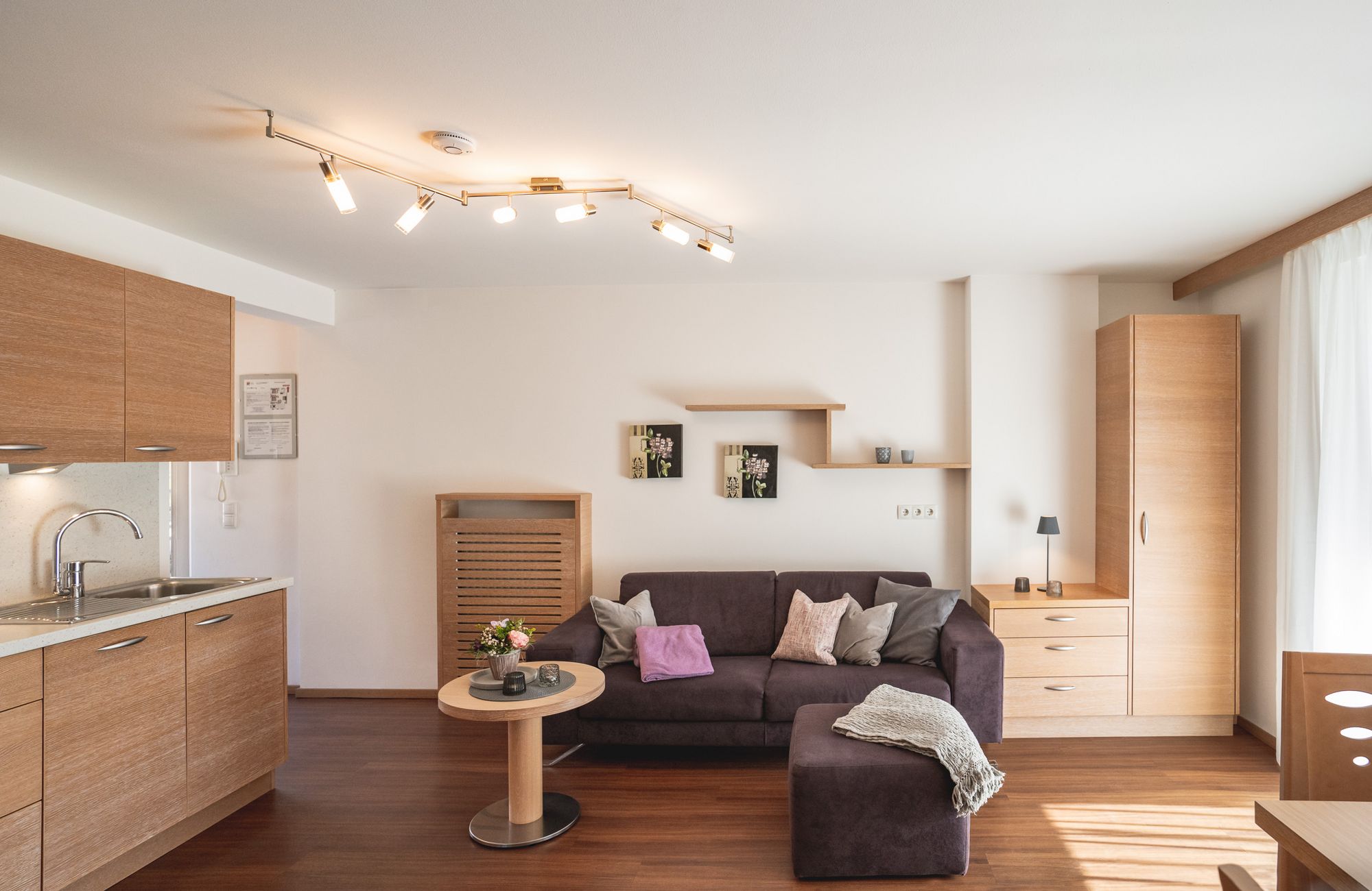 Jedes Appartement verfügt über getrennte Schlafräume, Bad mit Dusche/WC, einen hellen Wohnraum und eine große Terrasse (20 m²) mit Blick auf Meran.